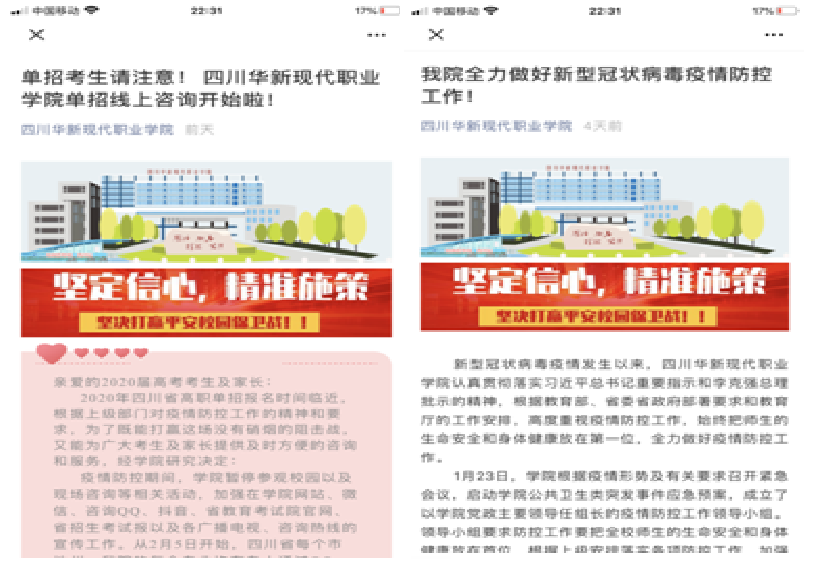 加强官方微信、官方网站、抖音、小视频、学院宣传片的优化和建设工作,整合线上资源,及时、同步发布我院单招信息。疫情发生以来,招就处与学院各部门高度协作,在学院官方微信发布《我院全力做好新型冠状病毒疫情防控工作》、《紧急扩散:四川华新现代职业学院单招线上咨询开始啦》、《战“疫”时刻,招生信息不延期,宅家就能选好校》等推文,在特殊时期向社会正能量发声。截止2月10日,共推出展现护理、幼儿发展与健康管理、电商等各学院、各专业的特色介绍推文27篇,抖音8篇,闪图10篇。