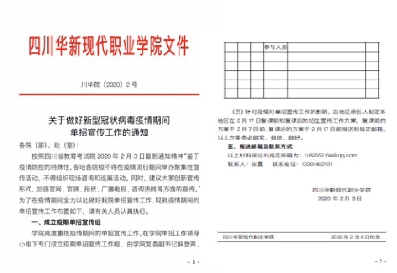 快速响应,上报方案。1月28日,根据疫情发展的新情况,学院招就处迅速拟定《四川华新现代职业学院2020年单招宣传方案》,经分管院领导审定后上报省教育考试院,在此方案中特别强调了在今年新型冠状病毒疫情还未完全平息的情况下,加大网络宣传是我院单招的重要宣传途径和方式。