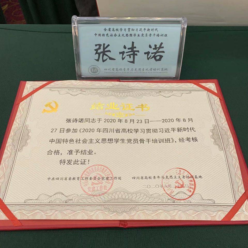 由省委教育工委主办,四川高校青年马克思主义者培训基地承办的全省高校学习贯彻习近平新时代中国特色社会主义思想学生党员骨干培训班于8月23日—8月27日举行。学院党委高度重视此次培训工作,按照政治思想素质好,在学习生活、服务师生及社会中先锋模范作用突出,学业成绩在本专业排名前30%以内等相关要求,最终推荐选派了工程管理学院党支部学生党员张诗诺同学代表学院参训。