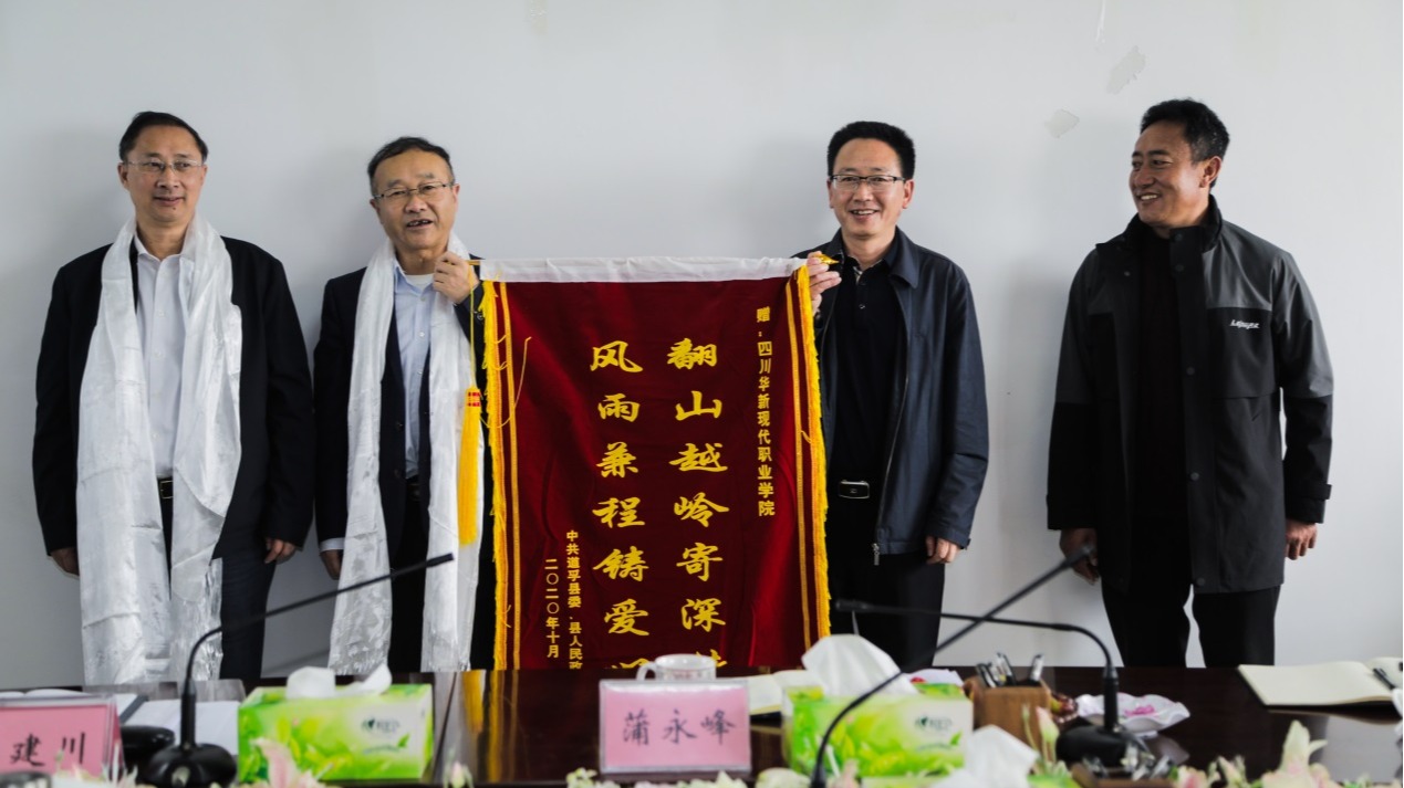 最后,蒲永峰代表道孚县委县政府、县脱贫攻坚领导小组、县委应对新冠疫情领导小组向我院赠送锦旗,并为学院各位领导献上了洁白的哈达,再次对华新学院长期以来的帮助和支持表示感谢,祝学院越办越好,培养越来越多优秀的人才。