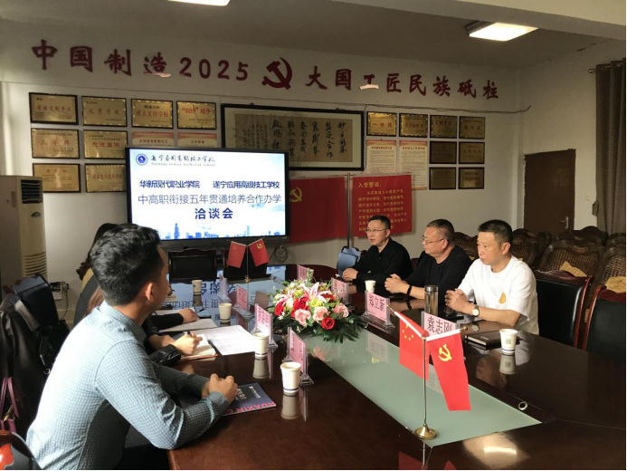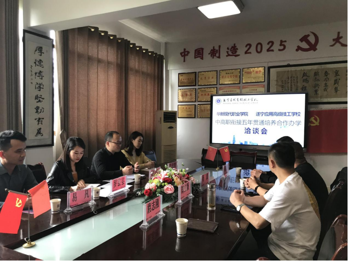 3月30日下午,华新学院对外合作处处长符又仁一行赴遂宁应用高级技工学校(以下简称遂宁应高学校)举办中高职衔接五年贯通培养合作办学洽谈会,遂宁应高学校党委书记、招生副校长吴锡春、教学副校长周洪、德育副校长郑立新、招生处长袁志刚、教务处长何汶君等领导参加了此次洽谈会。