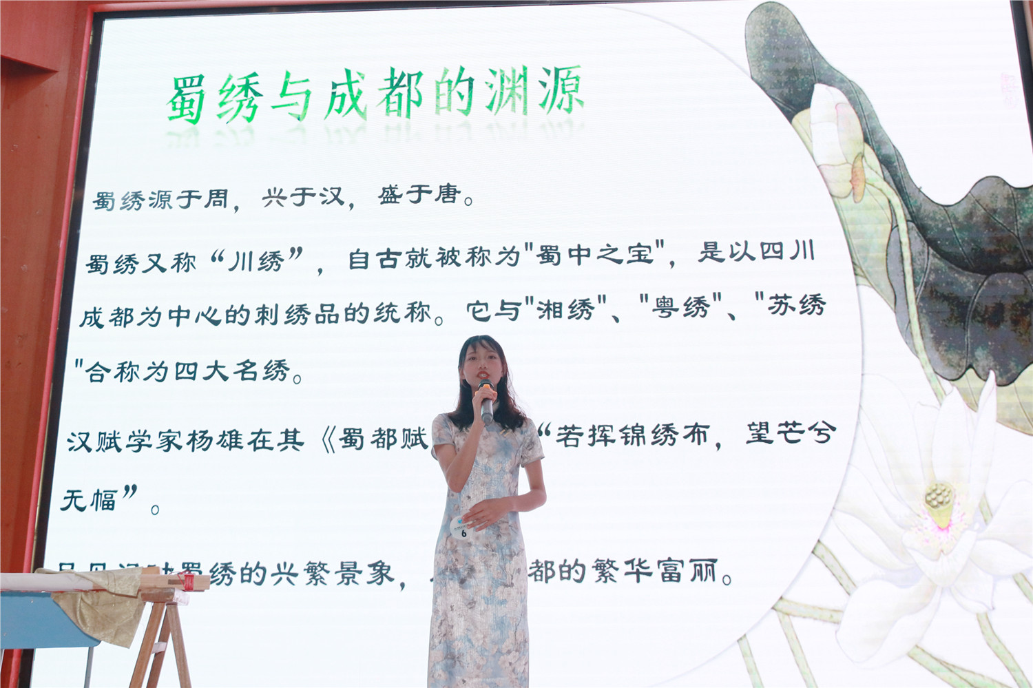 6号选手身着古典旗袍,带我们走进美轮美奂的蜀绣世界。作为"蜀中之宝",汉赋学家杨雄在其《蜀都赋》中云“若挥锦绣布,望芒兮无幅”,足见汉唐时蜀绣的富丽华贵。