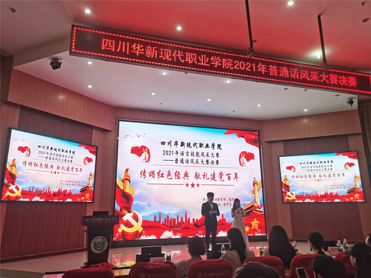 5月13日18时,华新学院基础教育部携手图书馆在学术报告厅隆重举办“2021年语言技能风采大赛——‘传颂红色经典、献礼建党百年’普通话风采大赛”决赛。