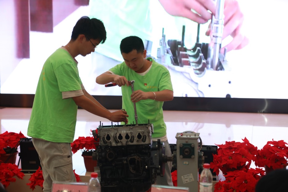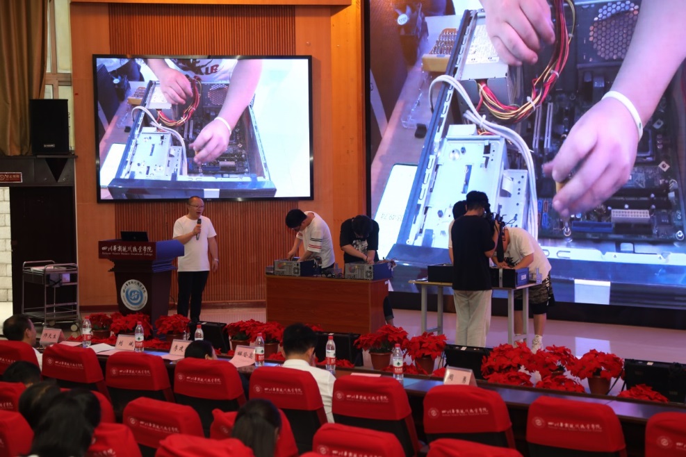 汇报展演伊始,工商管理学院带来的《幼儿户外操》迅速将典礼带到了一种欢快热烈的气氛当中,随后一个个精心准备的展演节目让我们重温了各个比赛的风采,展现了学生扎实的技能功底。25个比赛项目各显神通,或精心制作最能体现比赛特色、展示学生技能水平的展演视频,或直接进行现场展演,展示了汽车发动机拆装、蜀绣化妆镜制作、计算机主机拆装、工程测量、客运服务礼仪、紧急救护、护理礼仪等职业技能。