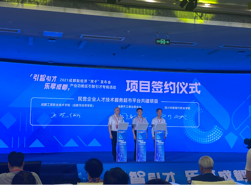 人才,是城市高质量发展的基石,高校是人才的摇篮。9月26日,由中共成都市委组织部、成都市人力资源和社会保障局、成都市新经济发展委员会、金牛区人民政府主办的2021成都新经济“双千”发布会产业功能区引智引才专场活动在成都市金牛区都市工业港举行。华新学院副院长刘斌、招生就业处处长郑晓霞、招生就业处叶代米垚作为签约高校代表参加大会。学院在大会上与成都市工商联就“成渝高精尖人才开发引智共享平台”成都市重点项目人才供需对接成功签约。