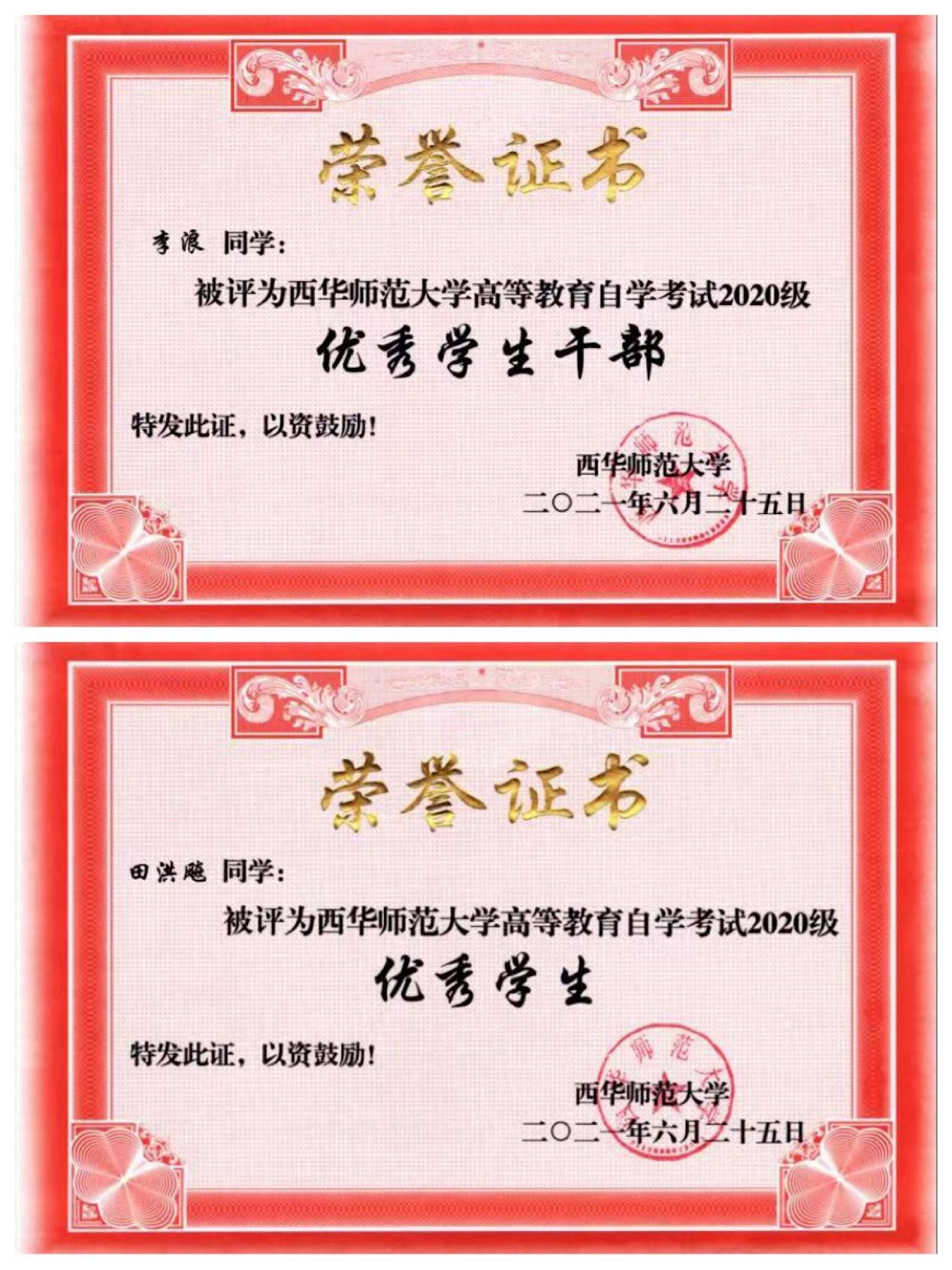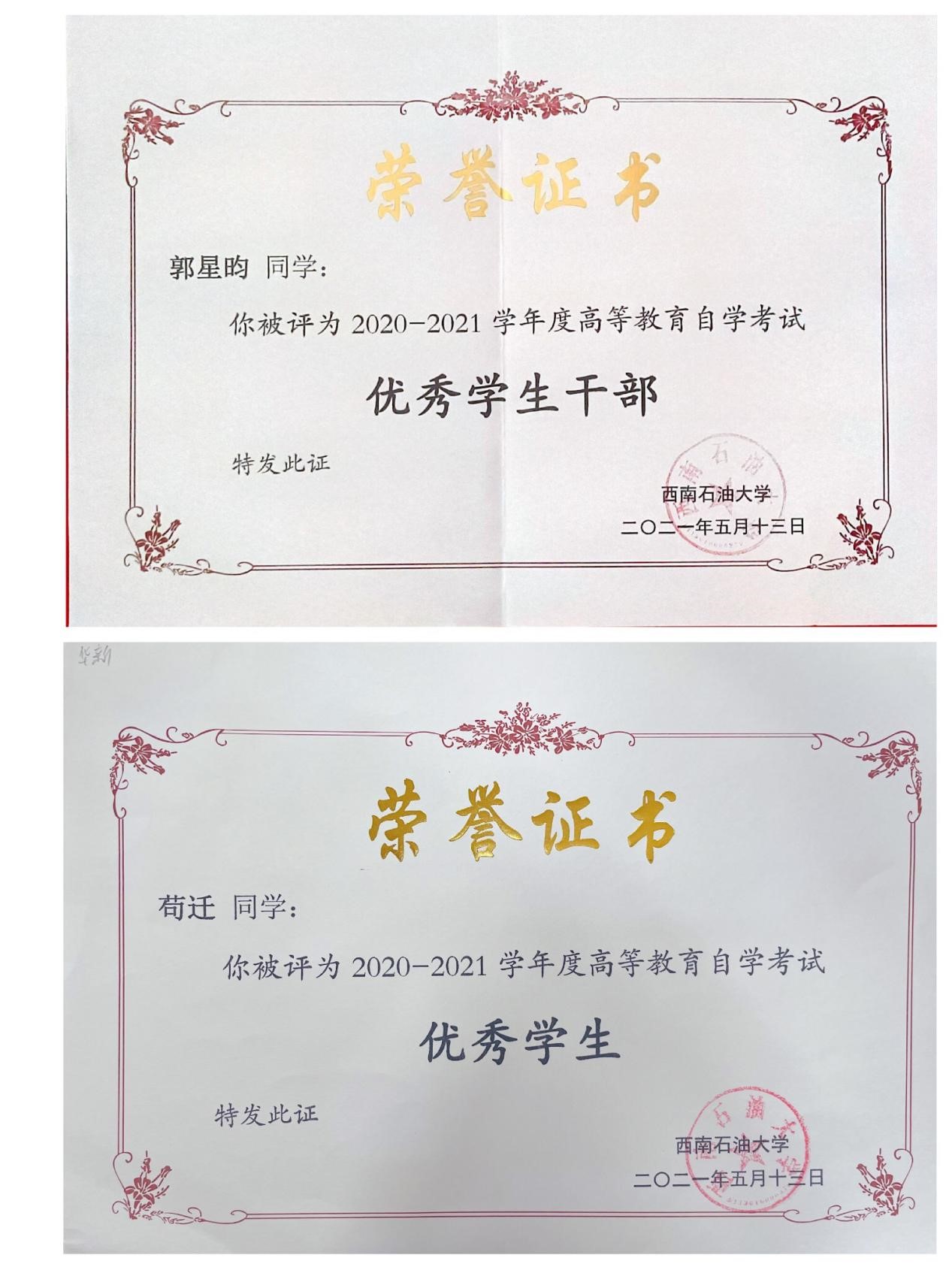 近日,从西南石油大学、西华师范大学再次传来喜讯。我院专本套读本科学子郭星昀、田洪飚等44名同学在本科学习期间,勤奋努力,表现优异,分获西南石油大学和西华师范大学2020至2021年学年度高等教育自学考试“优秀学生干部”和“优秀学生”的荣誉称号。