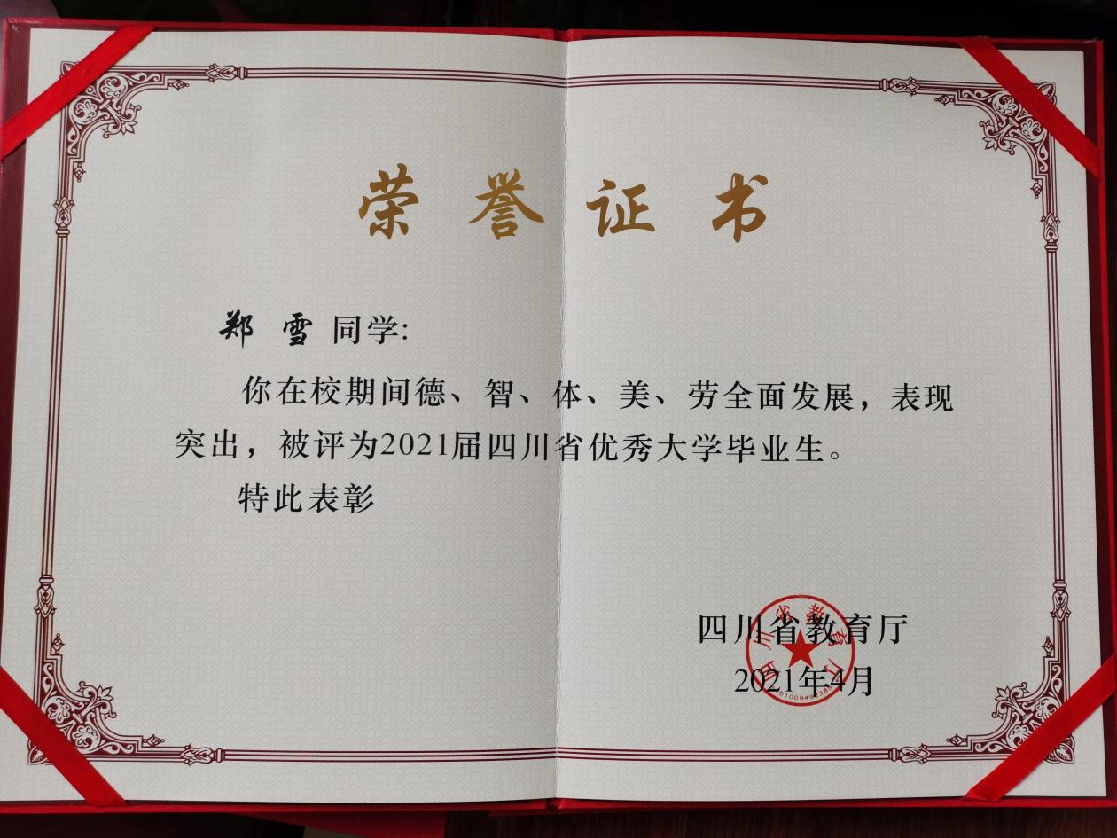 郑雪,北川羌族自治县人,四川华新现代职业学院2018级空中乘务专业毕业生,在校期间担任工商管理学院团总支副书记,荣获“2021届四川省优秀大学生”、“优秀共青团员”、“军训优秀学员”、“主题班会策划大赛一等奖”、“三好学生”、“勤学好学新青年”、“学院三等奖学金”等荣誉。