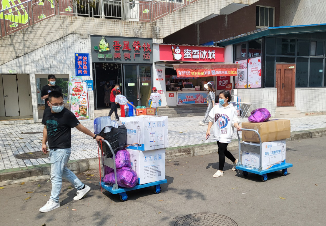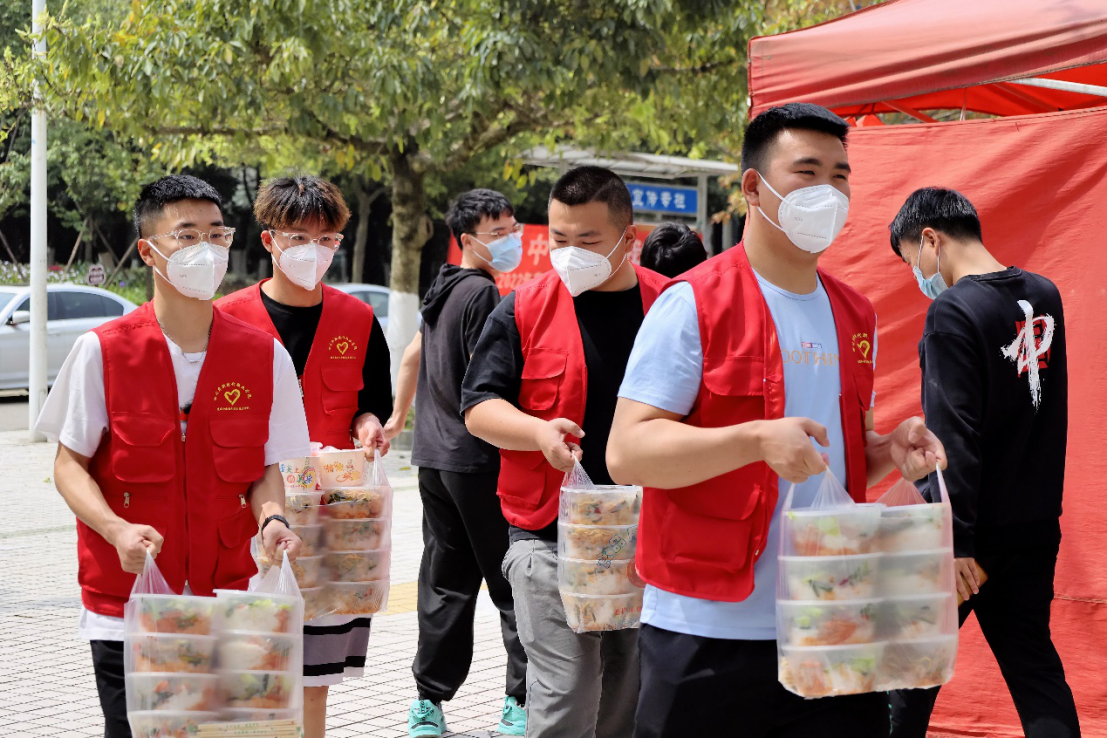 校园封控管理以来,学生志愿者成为了防控管理的重要力量。百余名以党团员为主的优秀学生志愿者迅速集结,积极参与到志愿服务中来,他们充当起老师的好帮手,学生的好朋友,这些“红马甲”每天不分时段忙碌在校园的各个角落,协助各部门开展核酸检测、物资补给、药品、餐饮运送等工作。特殊时期,每幢宿舍楼都由辅导员、学生以及后勤人员共同组成楼长、层长、寝室长的网格化管理体系,同学们自我管理、志愿服务,他们有呼必应,马不停蹄,在逆境中成长,学会了理解和感恩。