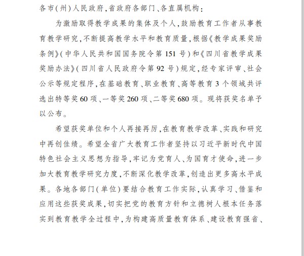 据悉,为激励取得教学成果的集体及个人,鼓励教育工作者从事教育教学研究,不断提高教学水平和教育质量,根据《教学成果奖励条例》(中华人民共和国国务院令第151号)和《四川省教学成果奖励办法》(四川省人民政府令第92号)规定,经专家评审、社会公示等规定程序,在我省基础教育、职业教育、高等教育3个领域共评选出特等奖60项、一等奖260项、二等奖680项,全省共有295个职业教育教学成果上榜。