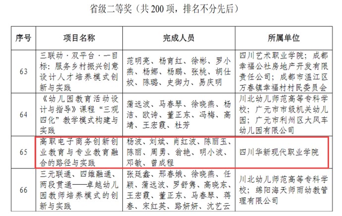 4月8日,四川省人民政府《关于公布2021年四川省教学成果奖的通知》(川府函[2022]85号),公布了2021年教学成果奖,华新学院《电子商务专业群创新创业教育与专业教育融合路径研究》获得2021年四川省职业教育教学成果二等奖。