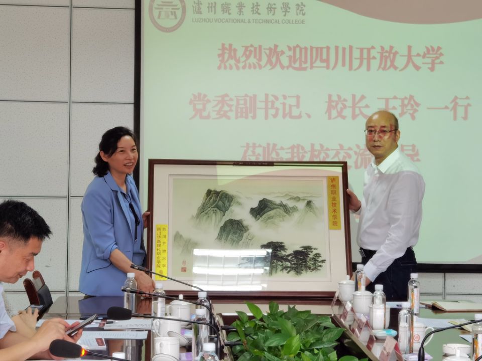 随后,双方在会议室开展座谈。泸州职业技术学院党委书记何杰、泸州职业技术学院党委副书记、院长谢鸿全、泸州职业技术学院副院长熊剑及相关部门负责人参加了座谈。会上播放了泸州职业技术学院、四川开放大学及四川华新现代职业学院的宣传片。王玲校长介绍了四川开放大学的办学历史、办学性质、办学规模、办学体系及办学成果。同时王玲校长还介绍了四川华新现代职业学院的概况、专业内涵建设及校企合作情况。随后,王玲校长代表四川开放大学和四川华新现代职业学院向泸州职业技术学院赠送了华新学院蜀绣专业学生作品,表达了对泸州职业技术学院的衷心感谢。