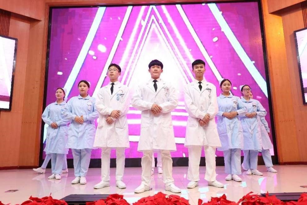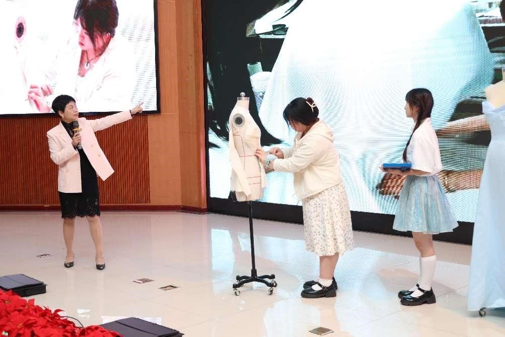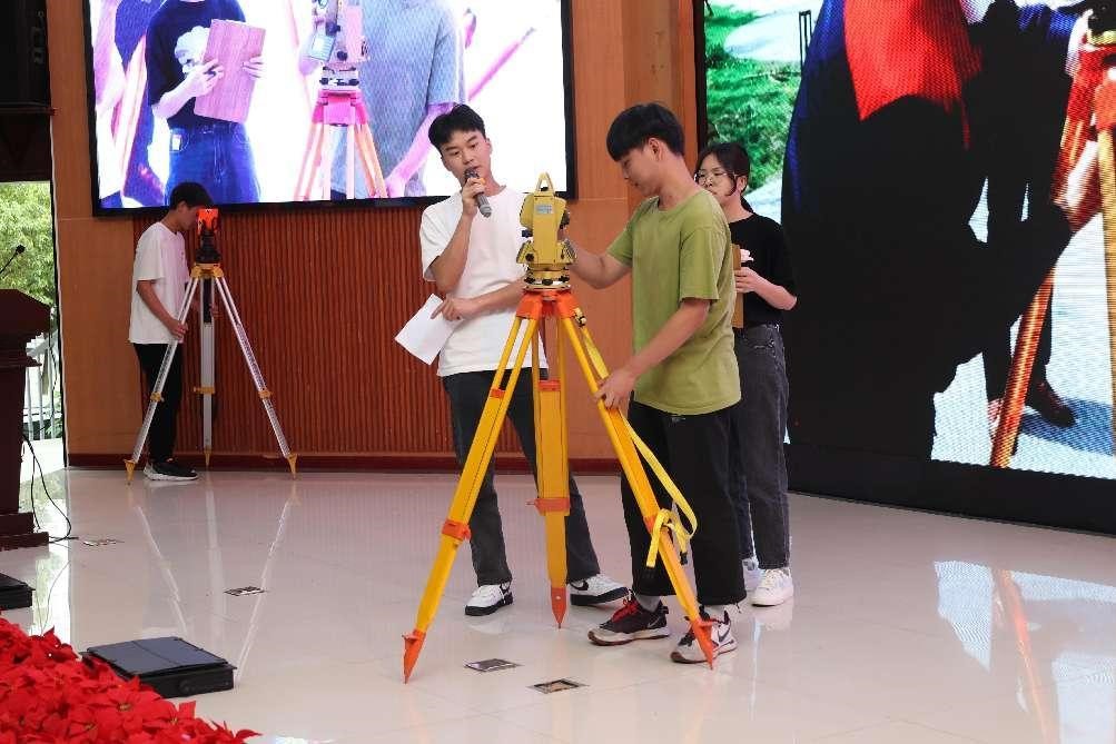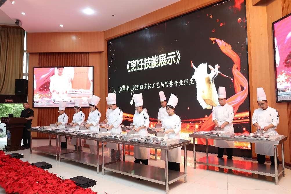 典礼过程穿插了具有代表性比赛项目的技能展示,同学们各显神通,有服装立体裁剪技能、汽车故障诊断技能、 “漫谈大运”的普通话技能、“测天量地、描经绘纬”的工程测量技能、护理礼仪与应急救护技能、烹饪技能等等,体现出学生扎实的职业技能功底。