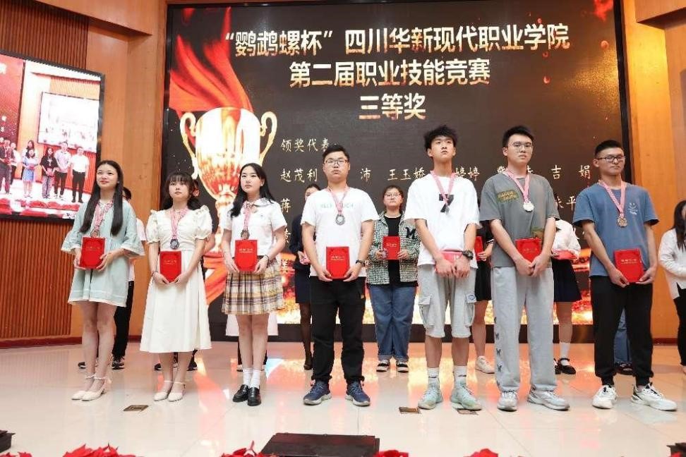 随后刘斌、涂捷、谭征及企业专家为22个比赛项目获得一、二、三等奖的学生代表及优秀指导教师代表颁发奖牌和证书。