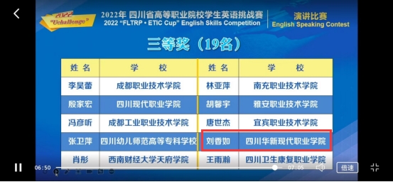 10月30日,由四川省教育厅主办,四川文化产业职业学院和外语教学与研究出版社联合承办的2022年四川省高等职业院校学生英语挑战赛以线上方式举行。四川省六十五所高职高专院校的二百多名选手参加此次比赛。华新学院经济管理学院21级文秘专业学生刘香如在第一轮淘汰赛中脱颖而出,成功晋级复赛,最终获得英语演讲大赛三等奖,电子商务学院21级电子商务专业学生陶钰以良好的迎战心态和扎实的语音功底获得英语写作大赛三等奖。