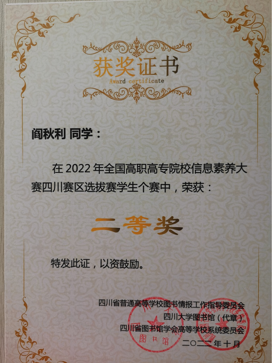 为进一步为贯彻落实《国家职业教育改革实施方案》文件精神,实现《教育信息化2.0行动计划》“三全两高一大”的发展目标,更好地完成《普通高校图书馆规程》关于“图书馆应重视开展信息素质教育”的重点任务,助力我院更快完成“提质稳扩”战略任务,特组织参加2022年“中文在线杯”全国高职院校信息素养大赛,我院喜获大赛“最佳组织奖”。
