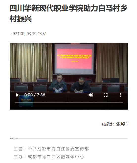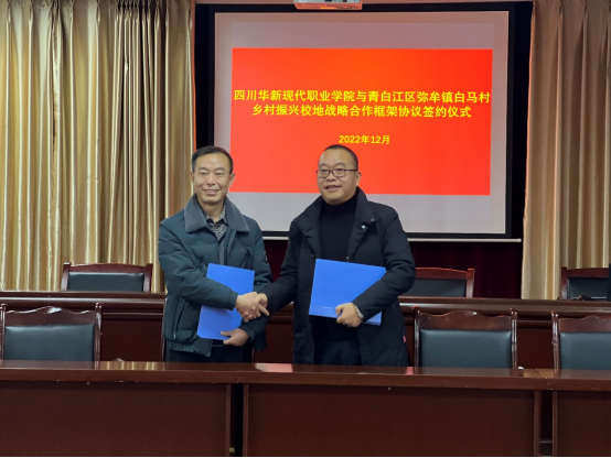2022年12月30日下午,在成都市青白江区弥牟镇白马村党群服务中心会议室,举行了四川华新现代职业学院与白马村村民委员会乡村振兴校地战略合作协议签字仪式,华新学院党委副书记、院长刘斌与白马村党委书记孟天勇分别代表双方在协议上签字。