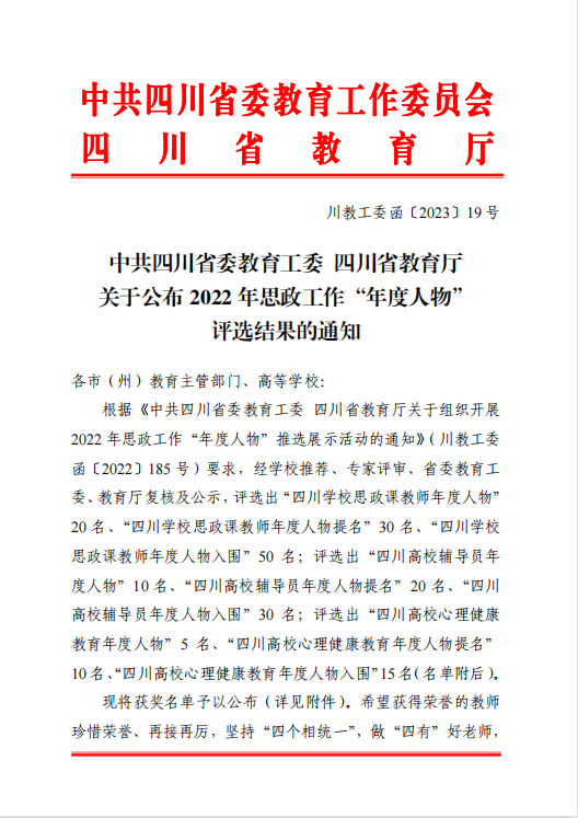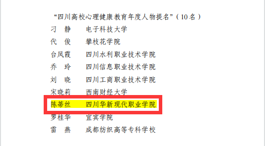 日前,中共四川省委教育工委四川省教育厅公布了2022 年思政工作“年度人物”评选结果。经学院推荐、专家评审、省委教育工委、教育厅复核及公示,评选出“四川高校心理健康教育年度人物”5名、“四川高校心理健康教育年度人物提名”10名、“四川高校心理健康教育年度人物入围”15名。华新学院医护学院副院长、心理健康中心副主任陈蒂丝在评选中进入前15名,荣获“四川高校心理健康教育年度人物提名”奖。华新学院是此奖项省内唯一获选的民办高职院校。