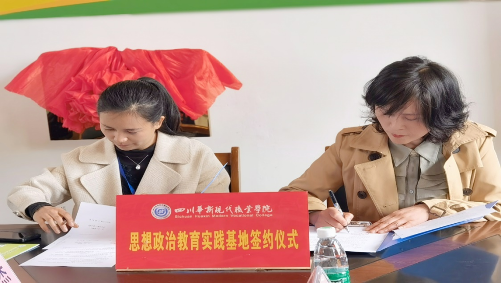 何红与杨敏现场签署了共建思想政治教育实践基地协议书,并与邛崃市教育局高促科王建彬科长一起为“四川华新现代职业学院思政教育实践基地”进行了授牌仪式。