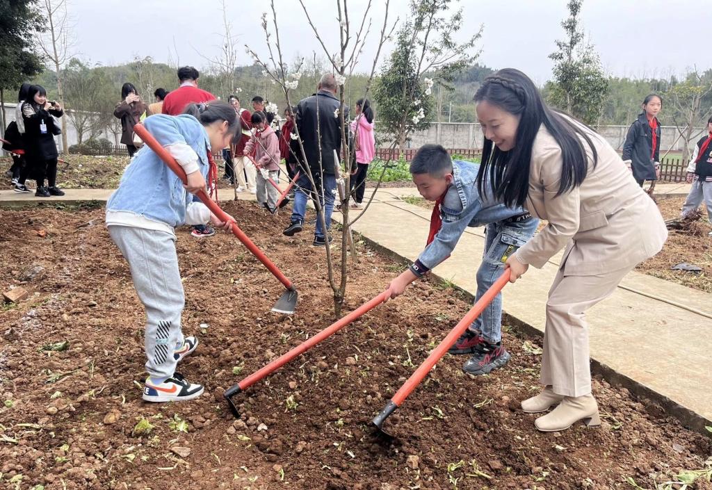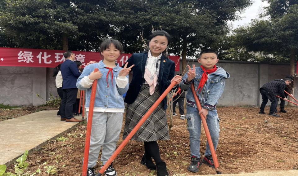 图九 马克思主义学院院长何敏与孩子们共同植树