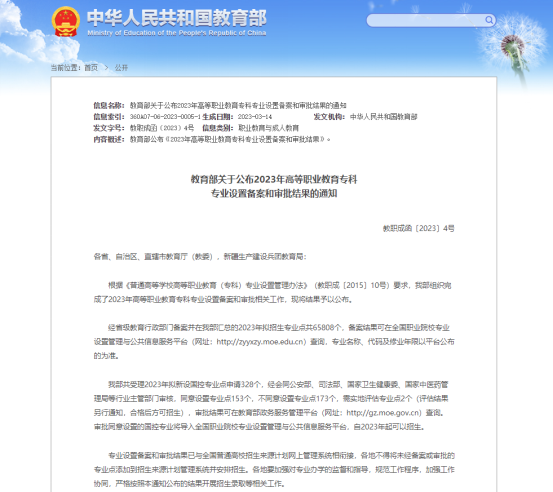 教育部本次共受理新设国控专业点申请328个,会同公安部、国家卫生健康委、国家中医药管理局等行业主管部门审核,同意设置153个,不同意设置173个。