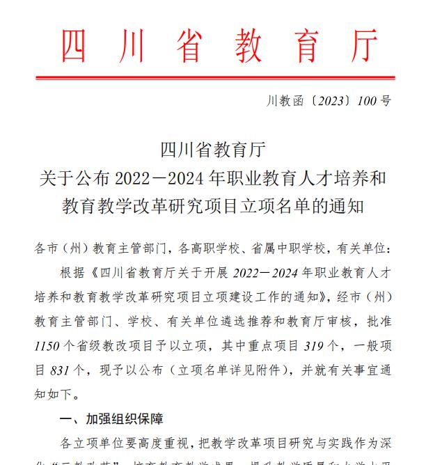 近日,四川省教育厅发布了《关于公布2022-2024年职业教育人才培养和教育教学改革研究项目立项名单的通知》(川教函〔2023〕100号),华新学院推荐的7个项目全部获批立项,其中其中2项重点项目,5项一般项目。