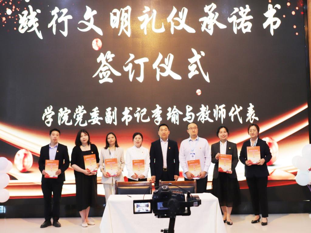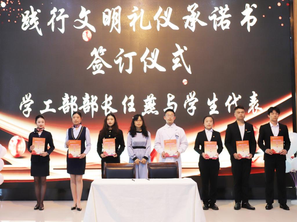 活动中,举行《践行文明礼仪承诺书》签字仪式。李瑜与二级学院教师代表签订倡议书,学工部(学生处)负责人与二级学院学生代表签订倡议书。