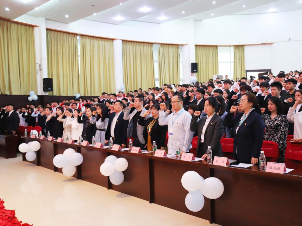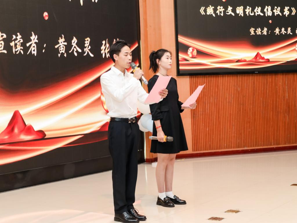 学生代表黄冬灵、张锋宣读《践行文明礼仪倡议书》并宣誓。他们倡议全院学生做文明守礼的传播者,做文明礼仪的实践者,做文明成果的维护者,积极参与到“美我·美校——文化养魂·文明修身”文明教育实践活动中来,共建和谐校园,共做文明华新人。