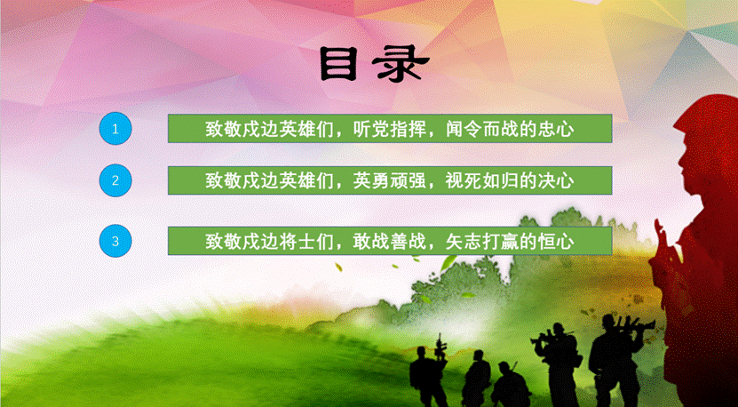 学生以《驻边将士,护佑中华》为题制作PPT页面,从忠心、决心、恒心为切入点致敬戍边英雄们,观点阐述明确、形式丰富。