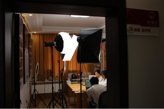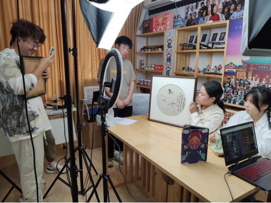 在金牛区电商直播产业基地的非遗·老字号直播室内,蜀绣技艺与工艺专业的朱玉洁同学担任主播,生动地介绍了直播间上架的蜀绣产品。电子商务和跨境电子商务专业的同学则担任助播和场控的角色,团队成员之间默契配合,出色地完成了直播任务。