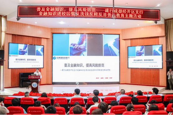 为加强学生金融知识的普及教育,帮助学生了解金融基础知识,提高金融素养和社会化能力,预防校园金融诈骗违法活动的发生,进一步加强预防电信网络诈骗宣传教育工作,全面提升高校师生识诈防诈能力,5月29日下午,华新学院联合建行成都经开区支行举行“金融知识进校园暨反洗钱反赌反诈”普法教育主题活动。华新学院副院长周勇,中国建设银行成都经济技术支行副行长李华、普惠金融事业部机构总经理杨春出席活动,财务处、保卫处全体工作人员及数字经济学院学生代表300余人聆听了讲座。