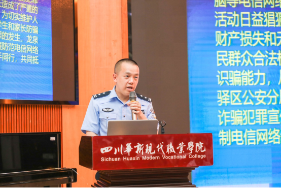 龙泉驿区公安局西河派出所警官王豪、成都市龙泉驿区公安分局反诈中心一级警长罗长弓,中国建设银行风险管理部征信业务牵头人杨莉瑶分别就识别网络犯罪、反电信网络诈骗、反洗钱和征信常识等方面的知识进行宣讲。他们通过实际案例,深入浅出地向广大师生讲解各类防骗知识。同时提醒师生提高金融知识综合素质和金融风险防范意识,加强个人信息保护,树立正确的消费观、理财观,有效维护好自身合法权益。