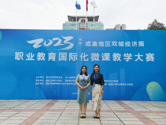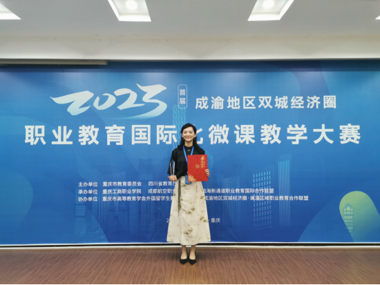 2023年(首届)成渝地区双城经济圈职业教育国际化微课教学大赛组委会由重庆市教育委员会和四川省教育厅分管领导共同担任主任,川渝两地教育行政部门有关业务处室负责人和具体承办单位有关负责人作为成员,统筹大赛的组织实施。经专家评审,共有54件作品进入总决赛环节。总决赛采取教师现场全英文演讲、评委提问的方式。团队负责人在决赛中发挥稳定,清晰简明地阐述了参赛作品的制作背景、内容及融入课程思政的积极意义,最终荣获中华文化类作品一等奖。