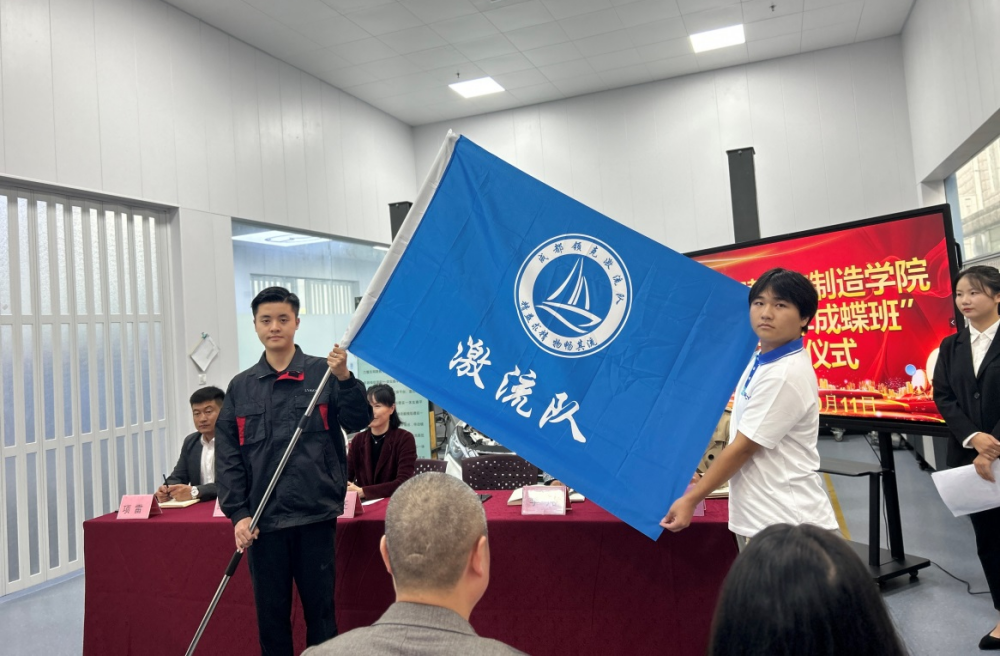 仪式上,钱佳向智造学院代表吉力此且授牌,并为2023级新能源汽车专业1班授旗。