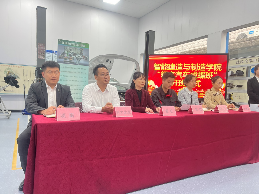 为进一步推进产教融合,创新现代学徒制人才培养模式,10月11日下午,华新学院智能建造与制造学院与领克汽车成都工厂在汽车实训室举行订单班开班仪式。领克汽车人事专员钱佳、华新学院副院长谭征、智造学院党支部书记李凡、副院长(主持工作)吉力此且、党支部副书记尹镜如、北方汽车负责人项雷、教师代表以及2023级订单班全体学生参加开班仪式。