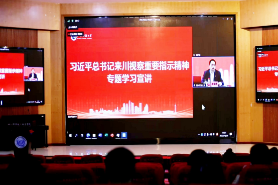 为了深入学习贯彻习近平新时代中国特色社会主义思想,10月20日下午,华新学院通过现场和网络直播的方式召开习近平总书记来川视察重要指示精神专题学习宣讲会,推动习近平总书记来川视察重要指示精神在学院走深走实、见行见效。报告主会场设在四川开放大学学术报告厅,分会场设在华新学院学术报告厅。学院全体院领导及中层以上干部在主会场参会。