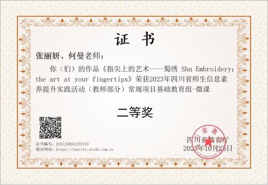 近日,由四川省教育厅主办的2023年四川省师生信息素养提升实践活动(教师部分)获奖作品名单揭晓,华新学院基础教育部英语教师团队的参赛作品《指尖上的艺术——蜀绣》在常规项目(高等教育组)中,获得了二等奖的优异成绩。