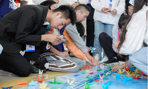 活动尾声,孤独症儿童和家长们及党员志愿者共同进行集体游戏“放飞手中鹤,扬帆新启航”。大家齐动手,把祝福写进千纸鹤,并粘在大海蓝天图上,将爱和祝福传递下去。
