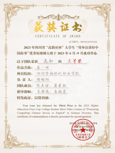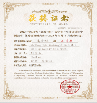 今年6月—9月,在由四川省教育厅主办,西华大学、高等教育出版社承办,四川省普通本科高校外国语言文学类专业教学指导委员会协办的2023年四川省“高教社杯”大学生“用外语讲中国故事”优秀短视频大赛短视频大赛中,华新学院选报的作品《合江豆花》喜获二等奖,另外两部作品《家味》、《茶馆小成都》喜获三等奖。