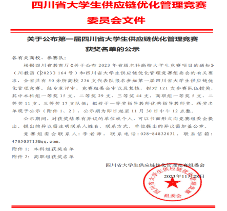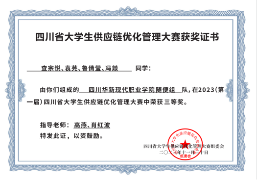 11月26日,由四川省教育厅主办,成都信息工程大学承办的第一届四川省大学生供应链优化管理大赛落下帷幕。全省本、专科50余所高校235支队伍参赛。华新学院数字经济学院2022级现代物流管理专业4名优秀学生组成的战队,经过指导老师近两个月的精心训练,在比赛中积极克服困难,不断突破自身能力,最终斩获三等奖。这是学院现代物流管理专业在供应链管理相关赛项中的首次获奖。今后,现代物流管理专业的教师们将响应学院“以赛促学”的要求,继续带领学生积极参与各项省级赛事,不断提升学生专业技能,磨砺学生吃苦耐劳、肯学肯干的职业精神。