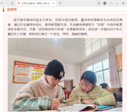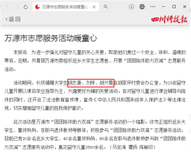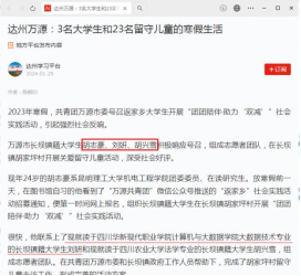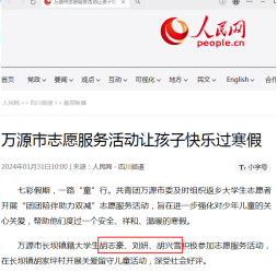 2024年1月正值寒假,华新学院2022级大数据技术专业学生刘妍积极响应万源市委发起的青年大学生返家乡寒假志愿服务活动的号召,和当地2名返乡大学生一起积极开展大学生“团团陪伴·助力‘双减’”社会实践活动。活动引起强烈社会反响,被学习强国、人民网等多家国家级主流媒体报道。