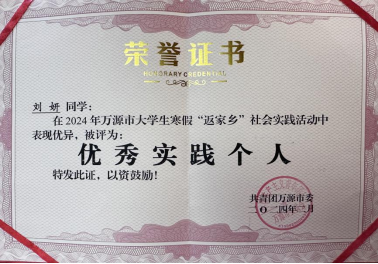 图十 共青团万源市委为刘妍颁发“优秀实践个人”证书