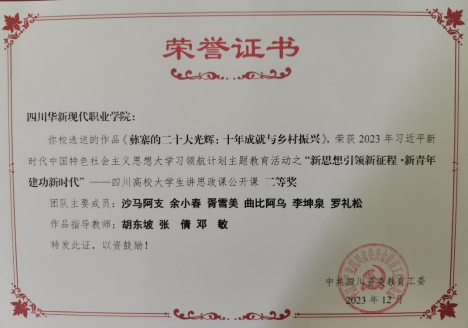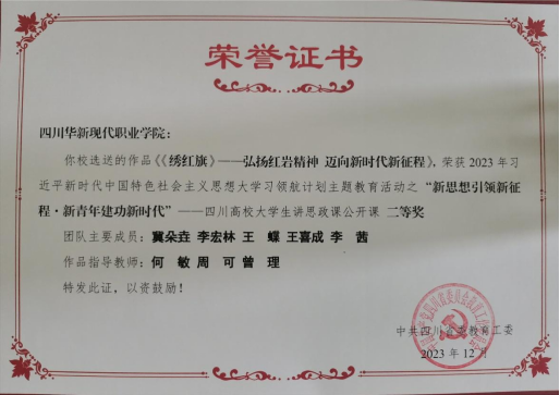 4月15日,四川华新现代职业学院收到中共四川省委教育工委颁发的荣誉证书,马克思主义学院参加2023年习近平新时代中国特色社会主义思想大学习领航计划主题教育活动,指导选送的两部作品均获“新思想引领新征程•新青年建功新时代”四川高校大学生讲思政课公开课二等奖。