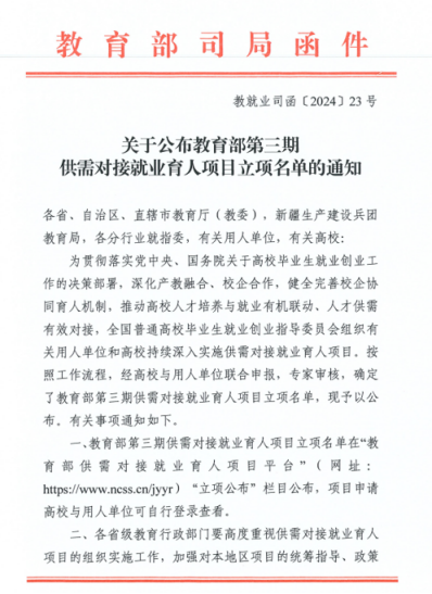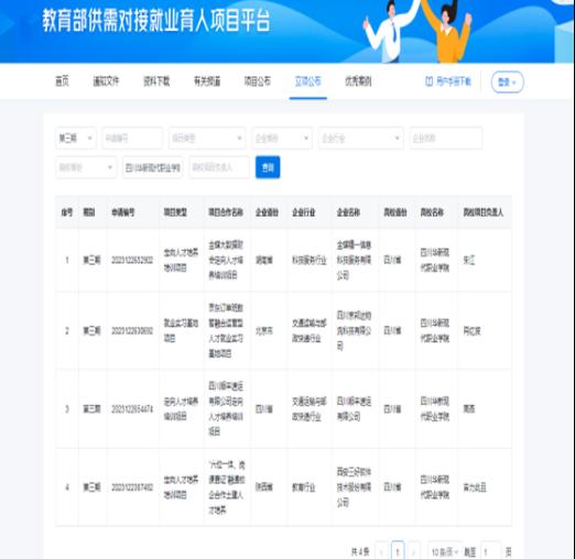 近日,教育部供需对接就业育人项目平台发布“关于公布教育部第三期供需对接就业育人项目立项名单的通知”(教就业司函﹝2024﹞23号),四川华新现代职业学院“金蝶大数据财会定向人才培养培训项目”、“京东订单班数智融合运营型人才就业实习基地项目”、“四川顺丰速运有限公司定向人才培养培训项目”、“六位一体岗课赛证融通校企合作土建人才培养”等四个项目成功立项。