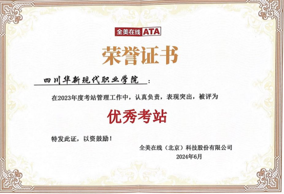 近日,从合作方传来喜讯,华新学院荣获全美在线(北京)科技股份有限公司(简称全美在线)颁发的“2023年度优秀考站”荣誉称号。