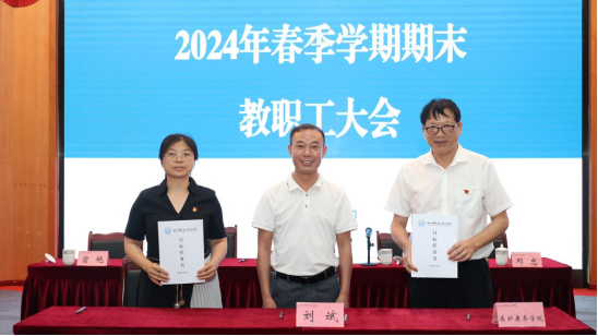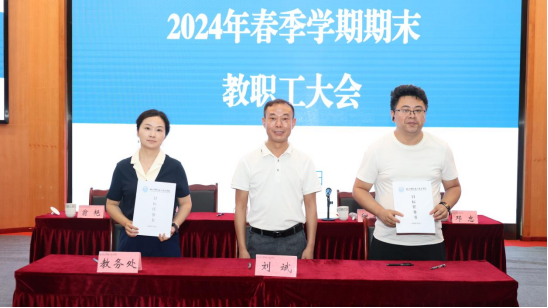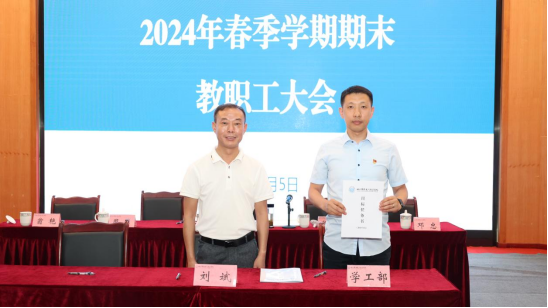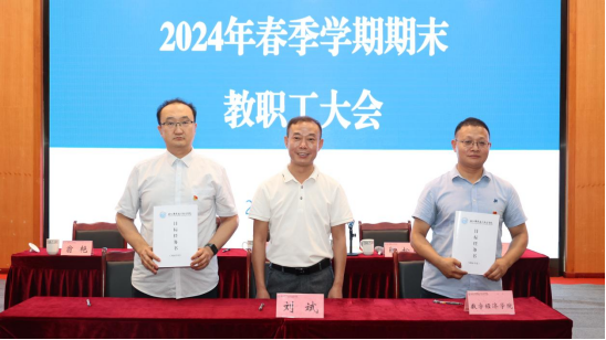 7月5日上午,华新学院召开2024年春季学期期末教职工大会,会议总结学院本学期工作,部署下学期主要工作任务,签订2024年目标责任书,推进学院高质量发展。学院党委副书记、院长刘斌主持会议并讲话,全体院领导参加。