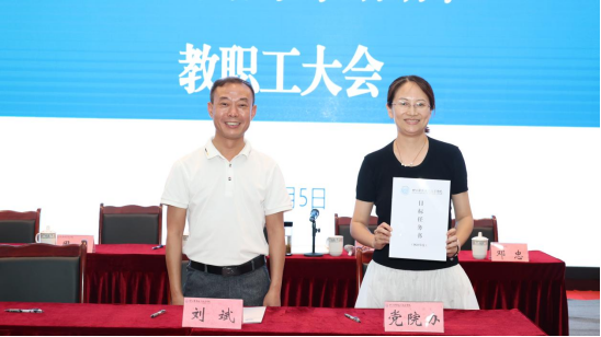 刘斌强调,要认真领会教职工大会各项工作要求,切实深化对实行目标管理重要性必要性和紧迫性的认识,把思想和行动统一到学院党委决策部署上来,进一步增强工作积极性主动性,坚定信心、奋力攻坚,对标对表指标体系抓实抓好相关工作。他指出,签订目标责任书就是吹响了前进的集结号,立下了攻坚的军令状,全院上下要把指标作为工作目标,把压力作为工作动力,把责任作为工作使命,以奋发有为的姿态、勤勉务实的作风,开拓进取、真抓实干,全力以赴完成既定目标,力争在重点领域和关键环节实现新的突破,取得一批新的标志性办学成果,用实实在在的行动和成绩推动华新学院高质量发展。