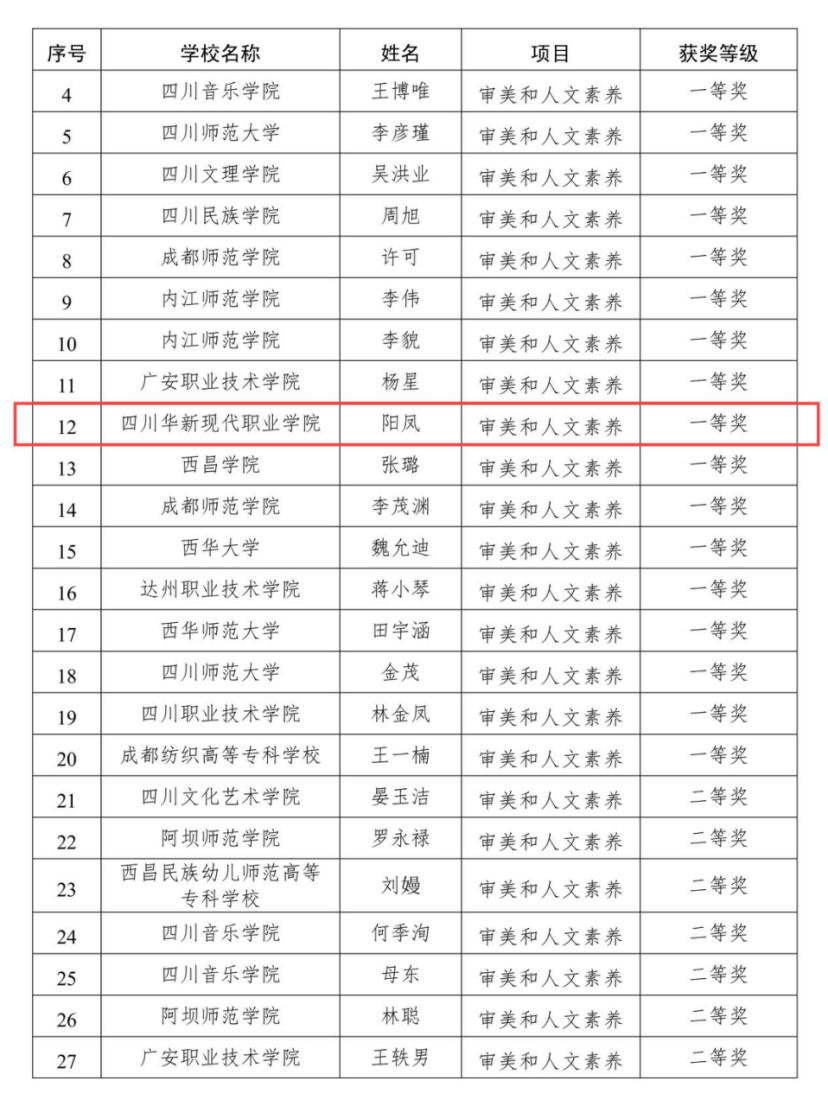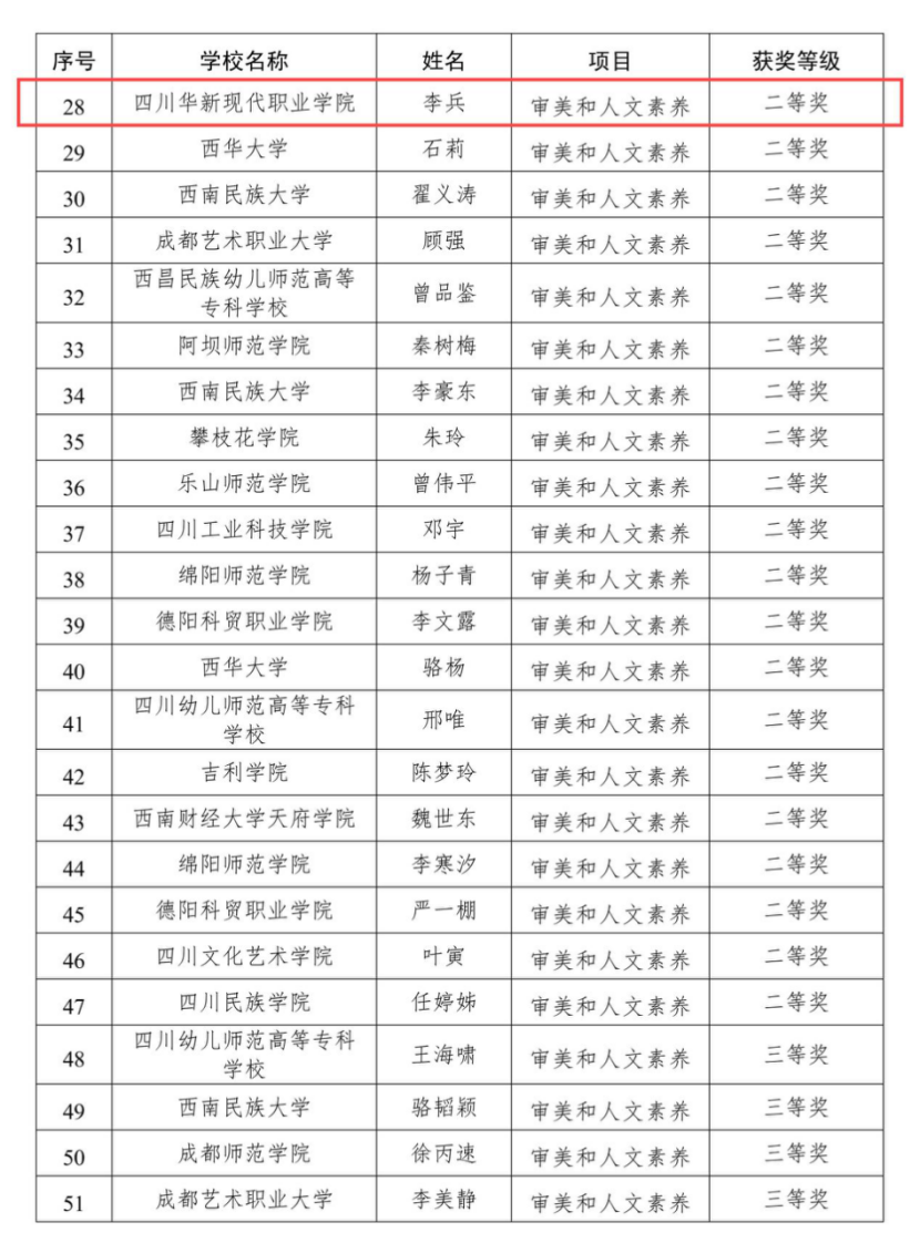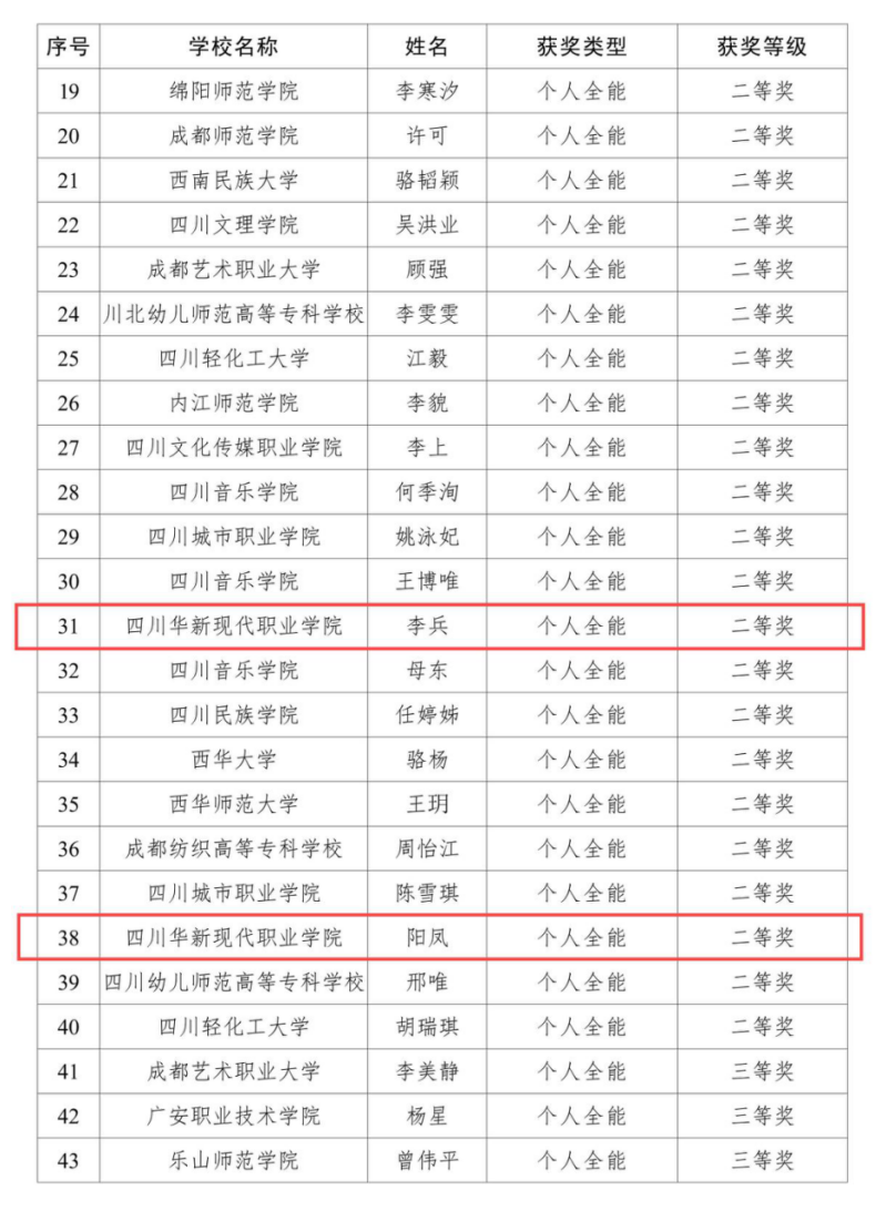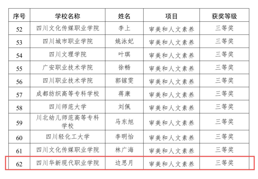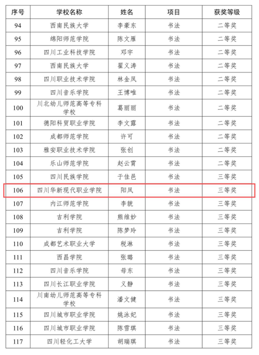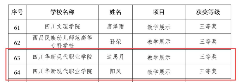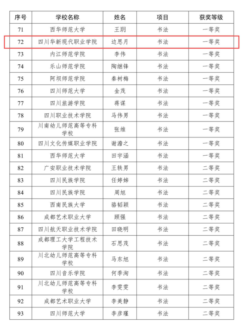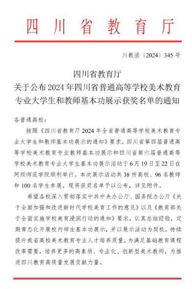 近日,由四川省教育厅主办的四川省第四届高等学校美术教育类专业教师基本功展示活动在阿坝师范学院举办。四川华新现代职业学院美术教育专业教师李兵、边思月、阳凤代表学院参加了比赛,经过紧张角逐,共斩获个人全能二等奖2项,个人单项一等奖3项,个人单项二等奖1项,个人单项三等奖4项。