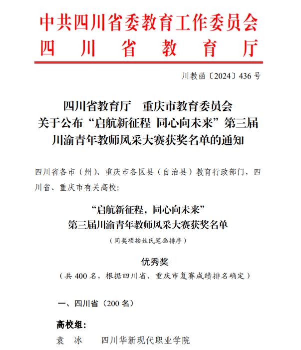 袁冰老师的获奖,不仅是个人荣誉的象征,更是四川华新现代职业学院乃至整个川渝地区教育事业蓬勃发展的缩影。她的事迹激励着我院青年教师不忘初心、牢记使命,继续在教书育人的道路上砥砺前行,为培养德智体美劳全面发展的社会主义建设者和接班人贡献自己的力量。