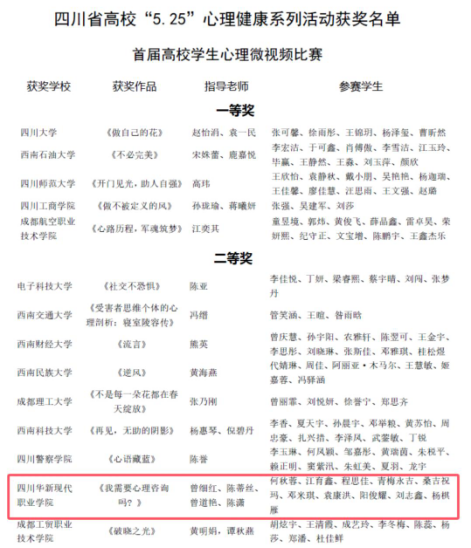 近日,在四川省心理学会高校心理健康教育专业委员会主办的2024年全省高校“5.25”心理健康系列活动中,华新学院学生团队在心理健康教育中心老师的指导和宣传部的支持下,凭借出色的表现,在高校学生心理微视频比赛中荣获二等奖,充分展示了学院在心理健康教育方面取得的优良成果和学生积极向上的精神风貌。