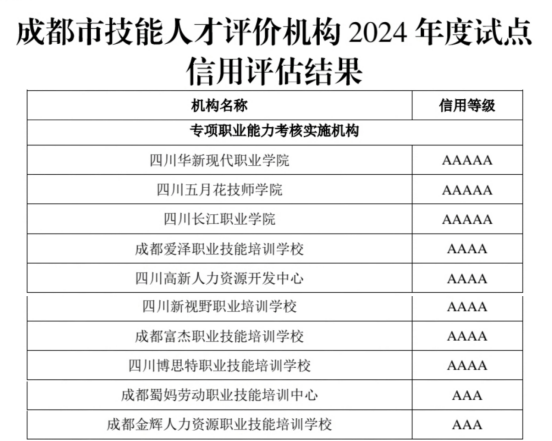 近日,从成都市职业能力建设指导中心传来喜讯,在2024年7月、8月开展的成都市技能人才评价试点信用评估工作中,华新学院作为首批专项能力考核实施单位接受了专家组现场评估,并获评为“5A”等级。